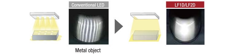 Efectiva para objetos luminosos brillantes. Chequeo visual muy rápido. El LED emite una luz uniforme con menos «granos» que reducen el reflejo y las sombras.