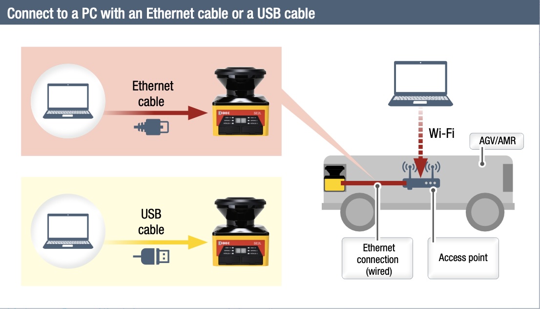 Conectividad avanzada vía Ethernet y Wi-Fi: permite configuración remota desde PC conectándose al punto de acceso del AGV/AMR mediante LAN o USB.
